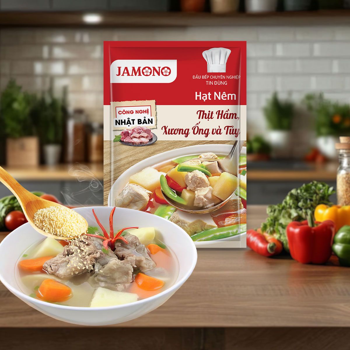 Hạt nêm JAMONO - Sự hòa quyện tinh tế từ các loại gia vị thuần Việt, được sản xuất theo phương pháp THỦY PHÂN ENZYME giữ nguyên hương vị của thịt hầm, xương ống & tủy. Giúp mang lại VỊ NGỌT THANH MÁT, THƠM NGON ĐẬM ĐÀ.